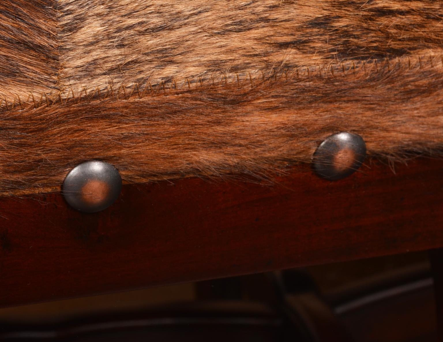 This beautiful bench features a patchwork of genuine hair-on leather and beautiful hacienda style legs. We love the soft texture of the hides, and the richness of the color. One of those great conversation pieces for your indoor Mexico living room, office or bedroom. Can also be placed as a "Welcome" for your guests near the front door. Perfect for a hacienda style home, a rustic Mexican colonial or an eclectic artistic condo.